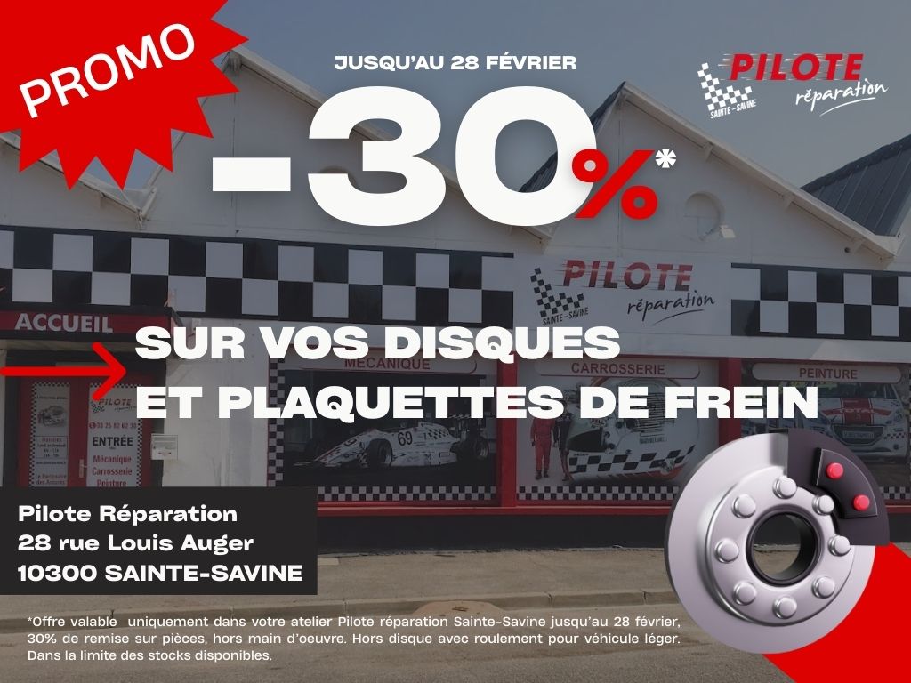 📅 Jusqu’au 28/02, profitez de -30% de remise* sur disques et plaquettes de frein dans notre atelier Pilote Réparation – Sainte-Savine.